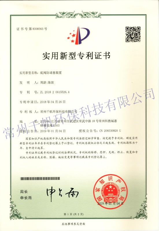 實用新型專利證書 底閥防堵塞裝置