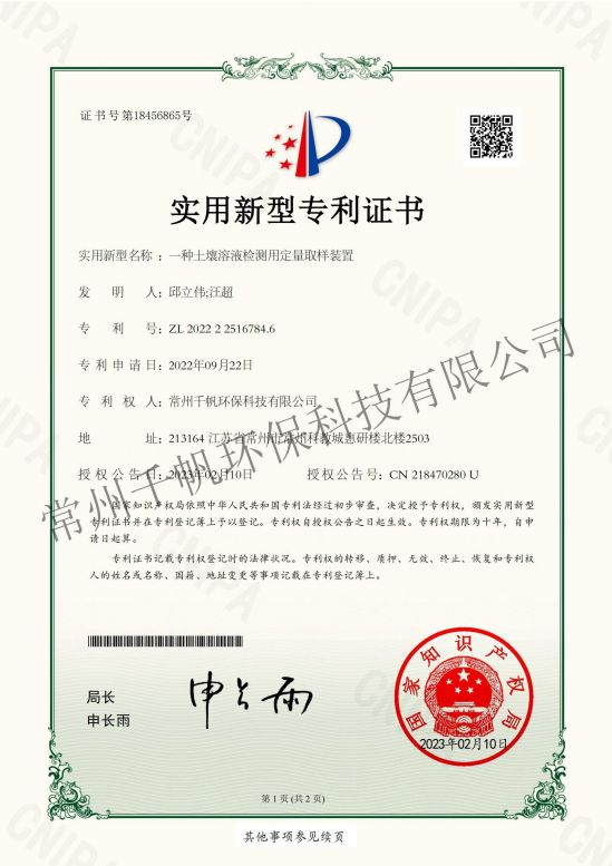 實用新型專利證書 一種土壤溶液檢測用定量取樣裝置